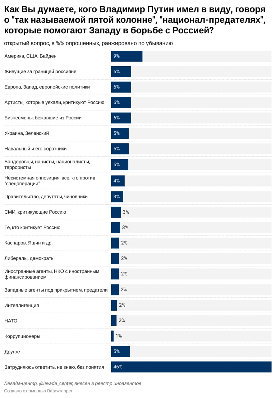 В российском обществе нет четкого понимания того, кого имеют в виду российские чиновники, когда говорят о “пятой колонне” и “национал-предателях”. Тем не менее можно выделить три широкие категории ответов на этот вопрос: “коллективный Запад” (западные страны, их лидеры, НАТО и др.), российские элиты (преимущественно уехавшие за границу или хранящие там деньги) и критики российской власти.