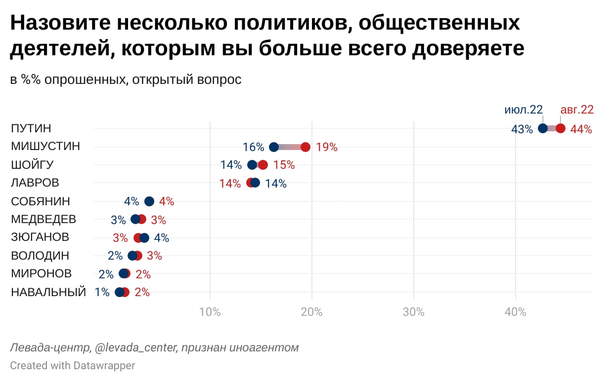 Августовский замер зафиксировал значительный рост доверия всем государственным и общественным институтам по сравнению с показателями прошлого года. Похожие резкие изменения настроений наблюдались и в 2014 году. Наибольшим доверием сегодня пользуются президент, армия, органы госбезопасности, правительство и церковь.