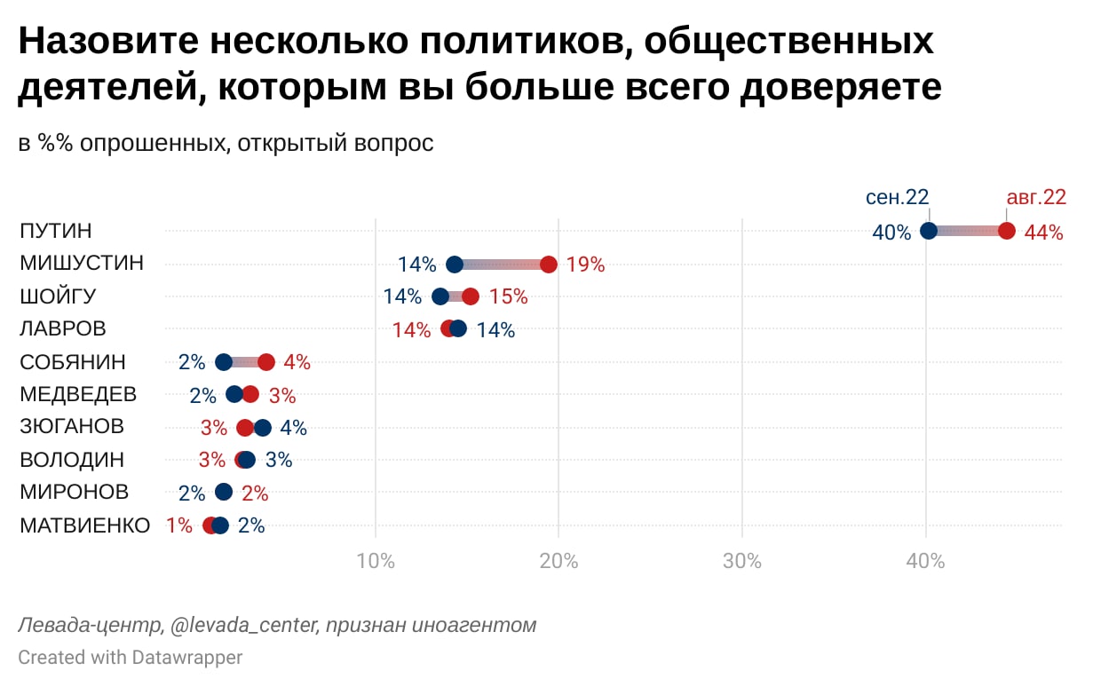 Августовский замер зафиксировал значительный рост доверия всем государственным и общественным институтам по сравнению с показателями прошлого года. Похожие резкие изменения настроений наблюдались и в 2014 году. Наибольшим доверием сегодня пользуются президент, армия, органы госбезопасности, правительство и церковь.