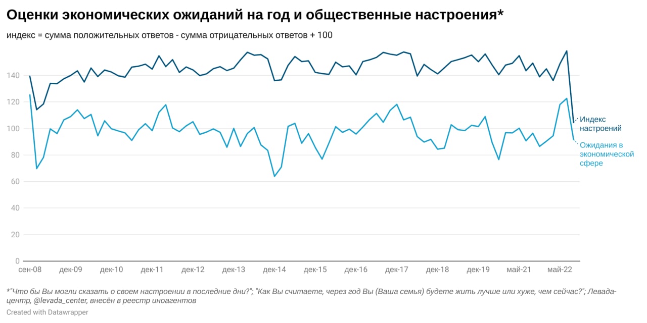 Потребительские настроения в августе 2022 года продолжили улучшаться. В то же время представления о текущем благосостоянии семьи, заметно улучшившиеся к началу лета, на протяжении летних месяцев оставались практически неизменны. Продолжают расти ожидания от следующих 12 месяцах для экономики страны, но оптимизм в отношении следующих пяти лет несколько снизился. Это указывает на разнонаправленные тенденции в общественном мнении.