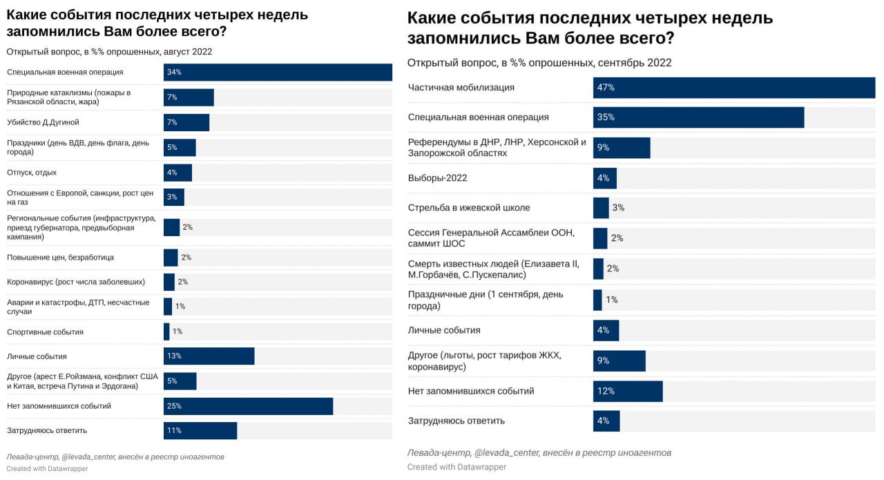 В сентябре респонденты чаще всего упоминали события, связанные с частичной мобилизацией (47%). Далее опрошенные отмечали “спецоперацию”, доля таких ответов с августа практически не изменилась: если в марте она запомнилась 75% респондентов, в апреле — 63%, в мае — 42%, в июле — 32%, в августе - 34%, в сентябре её отметили 35% опрошенных.