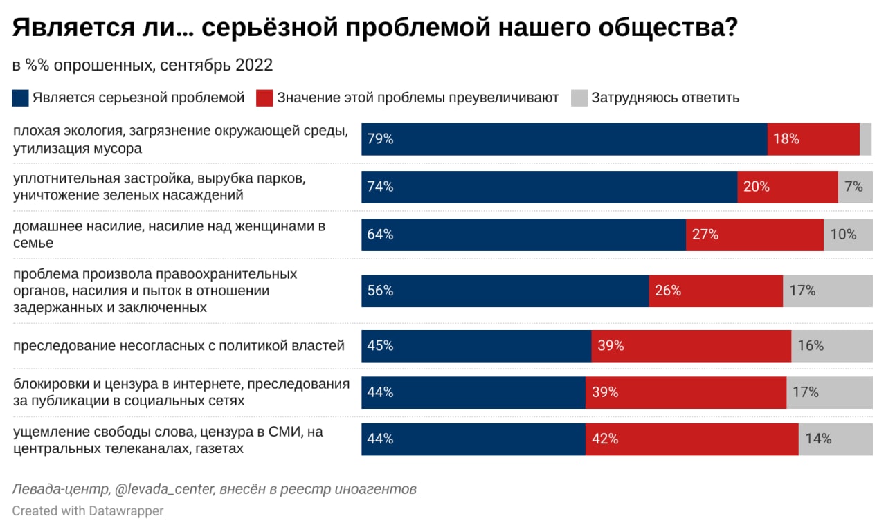 Три четверти опрошенных считают серьезными проблемами нашего общества плохую экологическую обстановку и загрязнение окружающей среды, а также уплотнительную застройку и вырубку зеленых насаждений. Две трети придерживаются такого же мнения относительно домашнего насилия. Большинство опрошенных готовы обращаться за профессиональной юридической помощью в случае нарушения их прав.