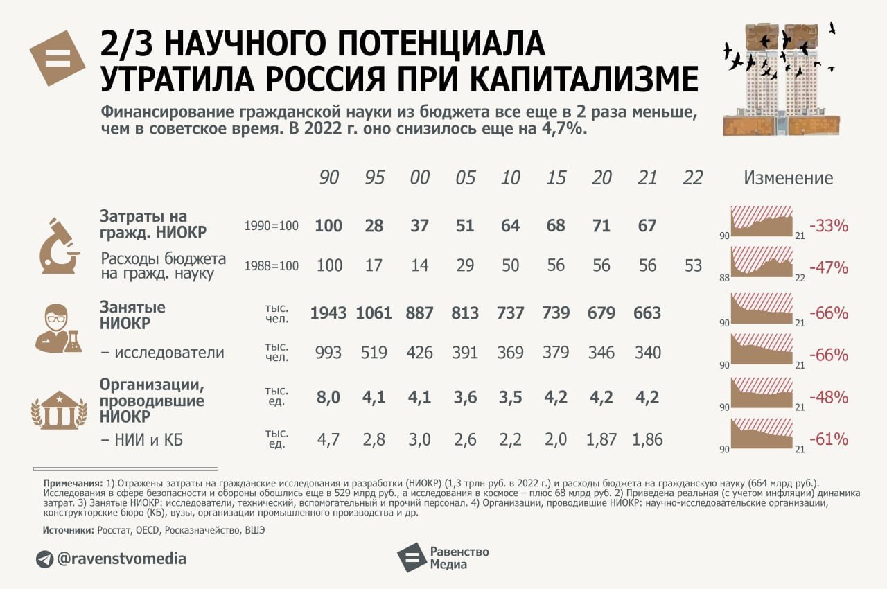 Мнение телеграм-канала «Равенство.Медиа»: сейчас в РФ на 1000 работников 56 занятых R&D (на Западе – 91). При Советах было в 3 раза больше. НТП планировался, а новаторами становились охотнее, ведь предприятия были своими. После приватизации бизнес активно сокращал НИОКР. Да и желание исследовать у работников пропадало. Ради чего? Чтобы новые хозяева, отнявшие у них собственность, туже набивали карманы?