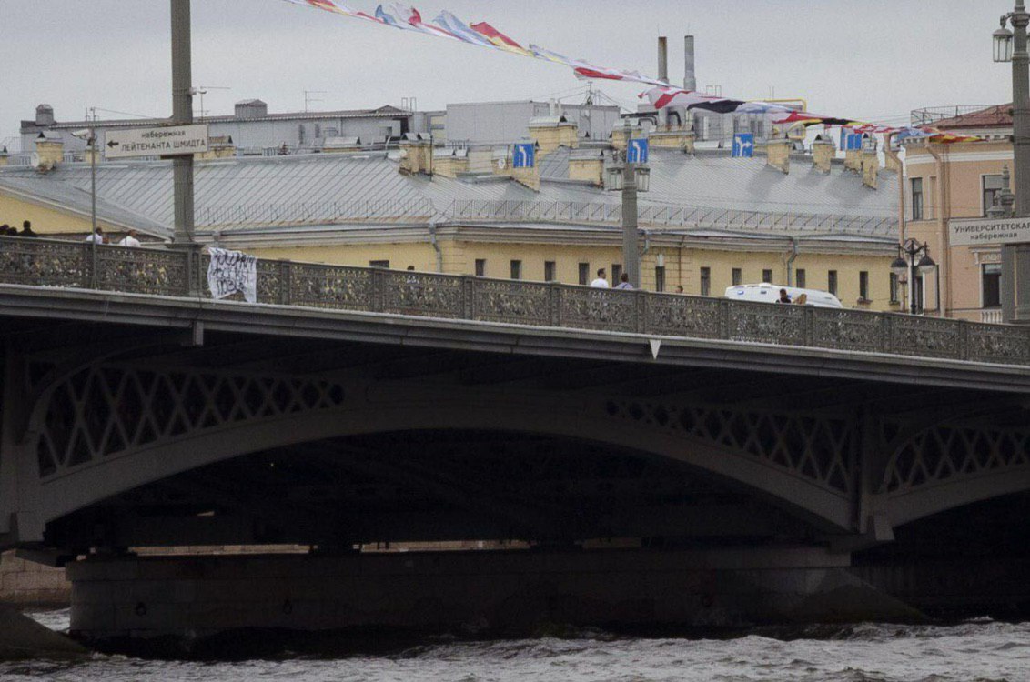 В Петербурге во время парада военно-морской техники активисты движения «Чайный клуб» провели акцию, посвященную полицейскому беспределу. Молодые люди выразили поддержку тем, кого жёстко задержали в Москве на митинге за честные выборы. Активисты вывесили на Благовещенский мост баннер с провокационной надписью: «Мусорам Москвы позор!».