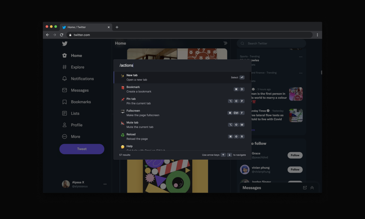 With Omni you can use your browser like a pro. Manage tabs, bookmarks, your browser history, perform all sorts of actions and more with a simple command interface.