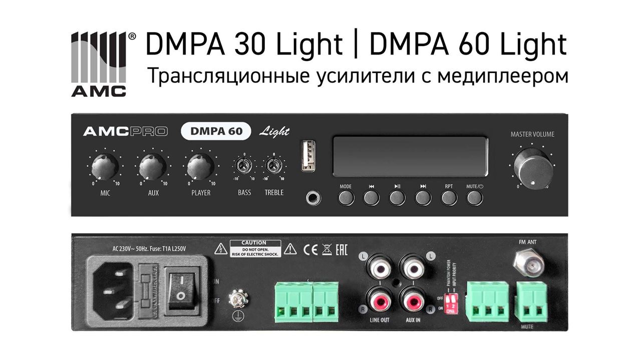 - DMPA Light — аудиоусилители класса D с импульсным блоком питания и выходным трансформатором на 100 В. Эти современные микширующие модели имеют встроенный USB-медиаплеер, вход AUX, Bluetooth и FM-радиоприемник, 1 вход для микрофона, функцию аварийного отключения звука.