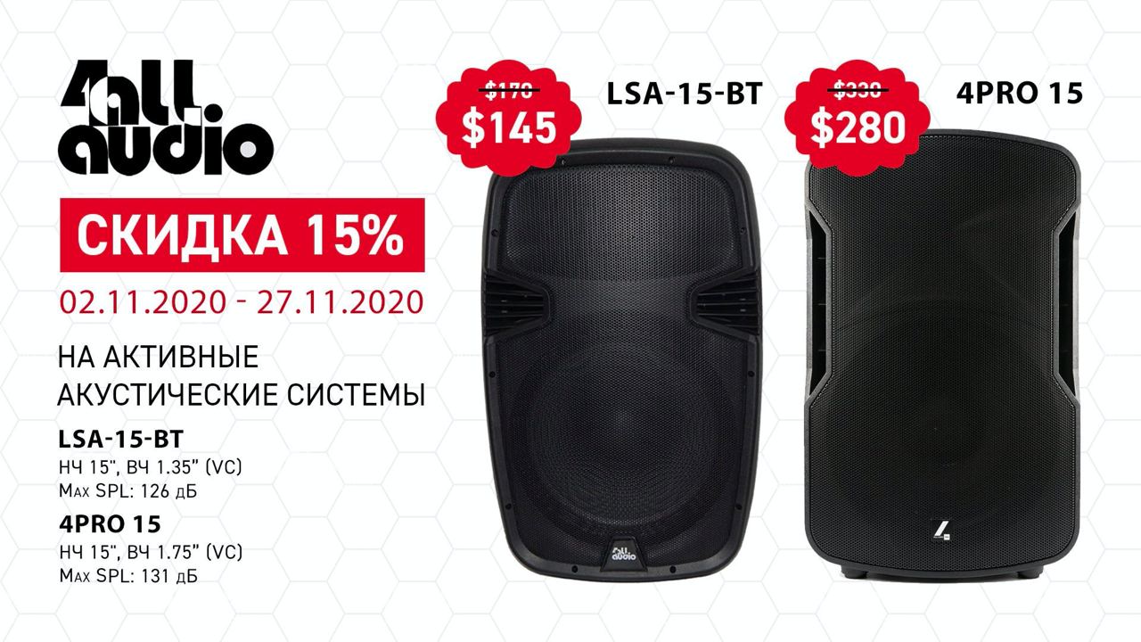С 2 по 27 ноября 2020 года, предлагаем скидку 15% на активные акустические системы 4all Audio LSA-15-BT и 4PRO 15.