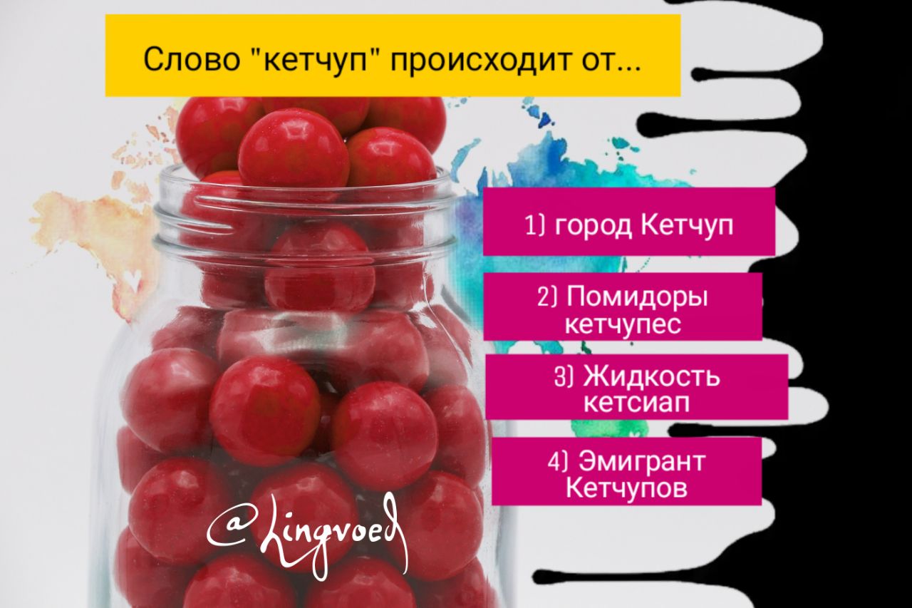 Как вы думаете, какова история происхождения слова кетчуп? Вот несколько вариантов ответов: назван по имени города Кетчуп в Новой Англии; по названию мексиканского сорта помидоров кетчупес; в честь китайской жидкости кетсиап, которой поливают моллюсков и рыбу; в честь русского эмигранта Петра Кетчупова (прибыл в Канаду в 1911). Голосуем!
