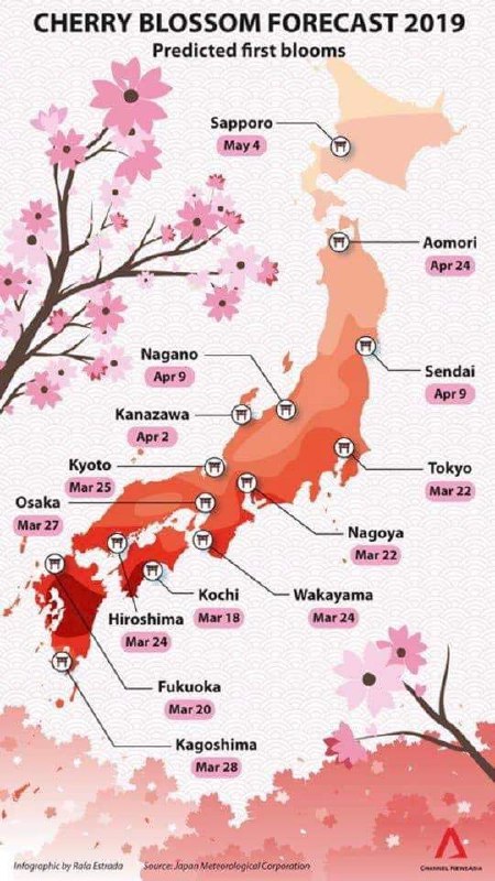 На рисунке: время цветения сакуры в Японии