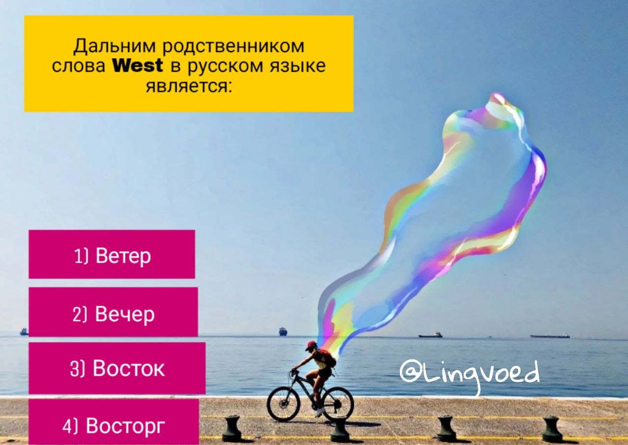 Как вы там, самоизолируетесь? Давайте хоть загадки поразгадываем. Слова, обозначающие стороны света, оказываются весьма древними в европейских языках, зачастую они указывают на связь с движением Солнца. Как вы думаете, какое русское слово родственно английскому West?