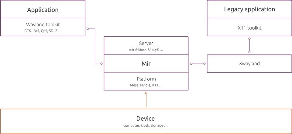 В рамах проводимой чистки из платформ mesa-kms и mesa-x11 убраны специфичные mesa-зависимости - из зависимостей оставлен только gbm, что позволило обеспечить работу Mir поверх X11 на системах с драйверами NVIDIA. Платформа mesa-kms переименована в gbm-kms, а mesa-x11 в gbm-x11. Также добавлена новая платформа rpi-dispmanx, позволяющая использовать Mir на платах Raspberry Pi 3 с драйверами Broadcom. В прослойке MirAL (Mir Abstraction Layer), которую можно использовать для ухода от прямого обращения к серверу Mir и абстрагирования доступа к ABI через библиотеку libmiral, добавлена возможность включения и отключения декорирования окон на стороне сервера (SSD), а также возможность настройки масштабирования в блоке DisplayConfiguration.