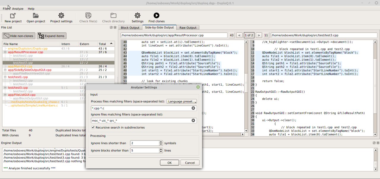 DuploQ представляет собой графический интерфейс к консольной утилите Duplo, предназначенной для поиска дублированного кода в исходных файлах (т.н. «копипаста»).