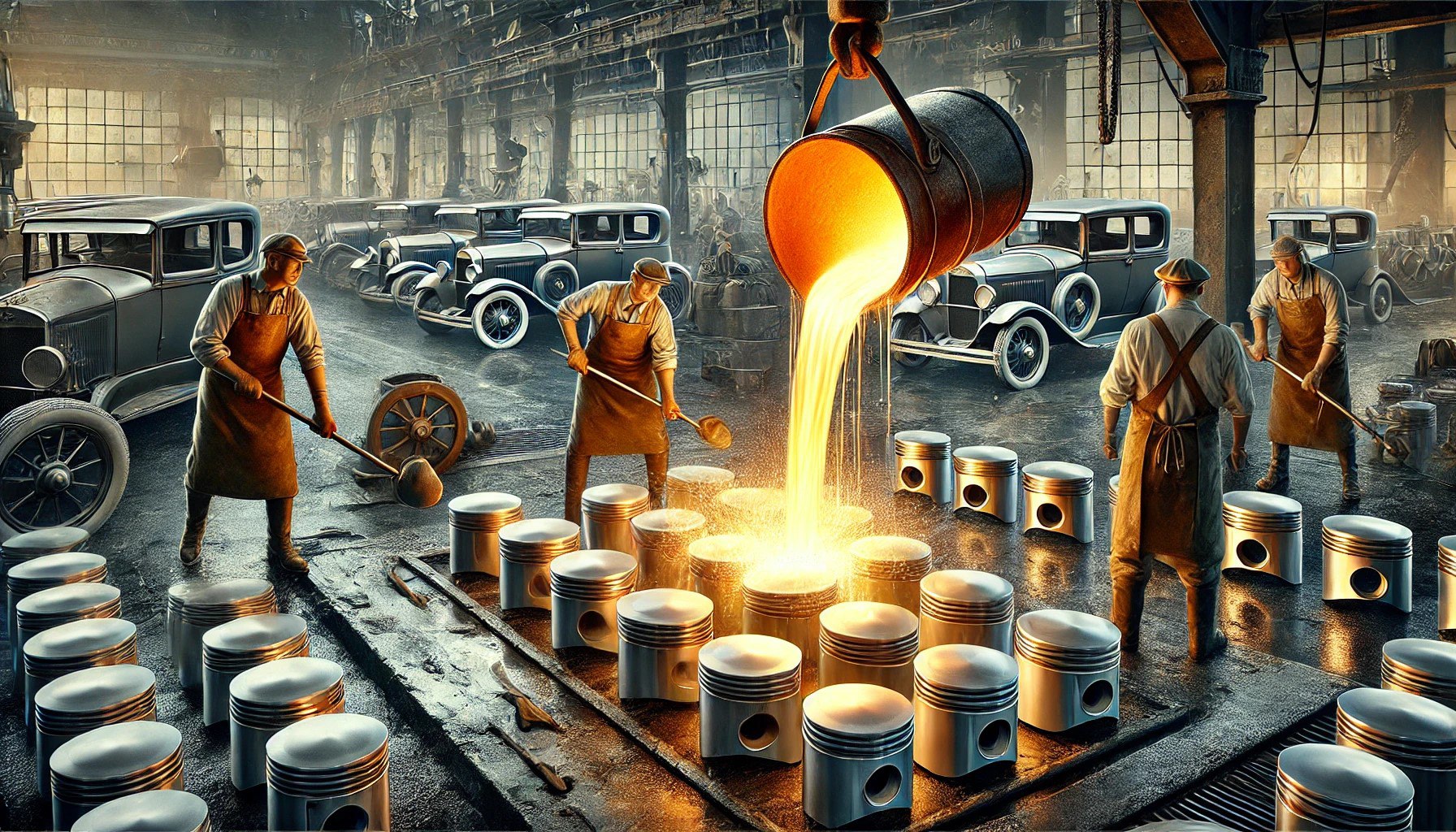 В 1930-х годах гравитационное литье алюминиевых сплавов в металлические формы стало важной технологией в автомобильной промышленности. Одним из ключевых достижений было использование этого метода для производства легких и прочных деталей двигателя. Одним из первых крупных производителей, которые начали использовать гравитационное литье алюминия, была компания Ford. В 1931 году компания начала массовое производство алюминиевых поршней для своих автомобилей. Эти поршни были легче и эффективнее, чем традиционные стальные, что позволило улучшить производительность и экономичность автомобилей.