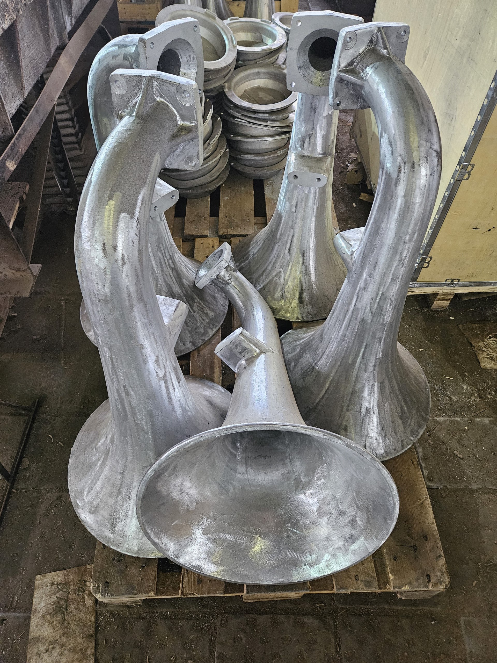 На фотографии отливки рупора. Рупор изготовлен из сплава АК7пч, весит 14 кг. Заказчик присылал видео с испытаний, дома это устройство точно запускать не стоит, гудит очень громко.