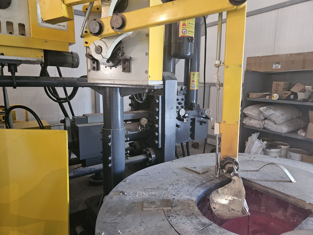 Робот-заливщик черпает из печи алюминиевый сплав в необходимом объеме, машина в автоматическом режиме производит запрессовку металла и раскрытие формы. Готовую отливку забирает другой робот, в это время третий смазывает форму.