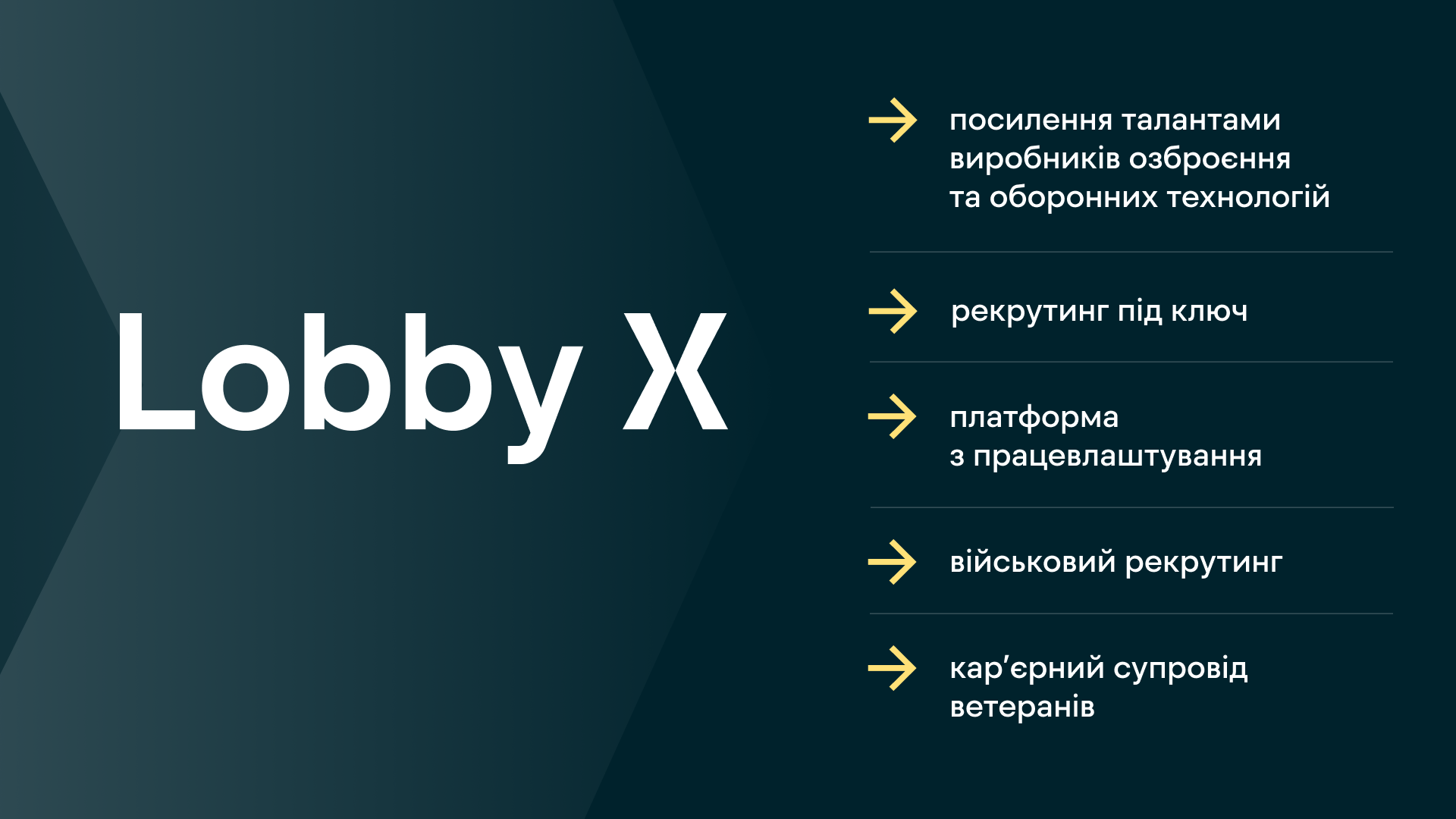 Lobby X — це рекрутингова платформа, що діє як соціальне підприємство. Ми працевлаштовуємо задля прогресу та перемоги України.