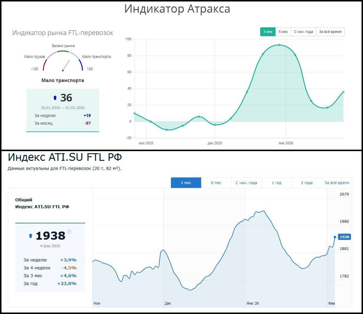 Сигнал о заметном усилении спроса и формирующемся дефиците свободных машин. Для сравнения: 3 февраля 2025 индикатор был на −77 (мало грузов и переизбыток транспорта)