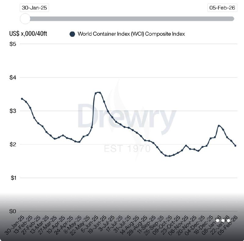 Он упал на 11,5% с прошлых данных — до $1 959 за 40-футовый контейнер: