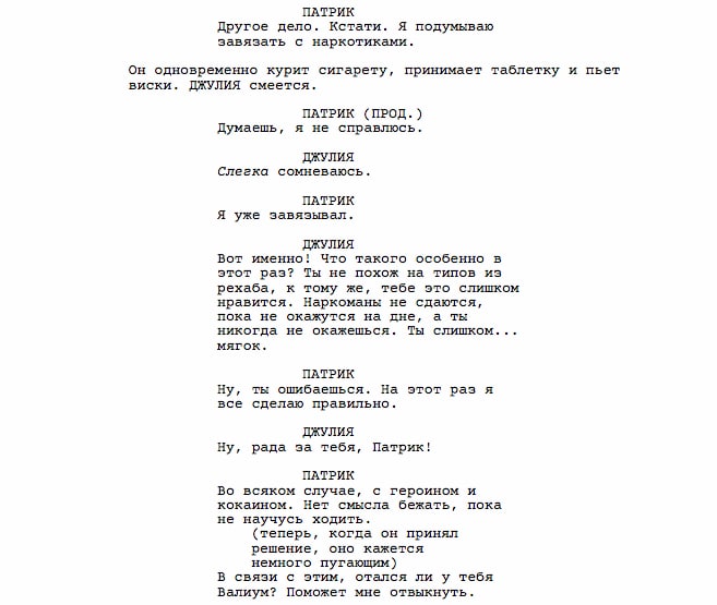 На финальном монтаже у нас, впрочем, все выглядит немного иначе. В угоду зрительскому восприятию свои собственные мысли Патрик произносит вслух, в то время как в сценарии весь диалог разворачивается закадровыми голосами.
