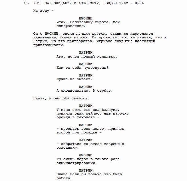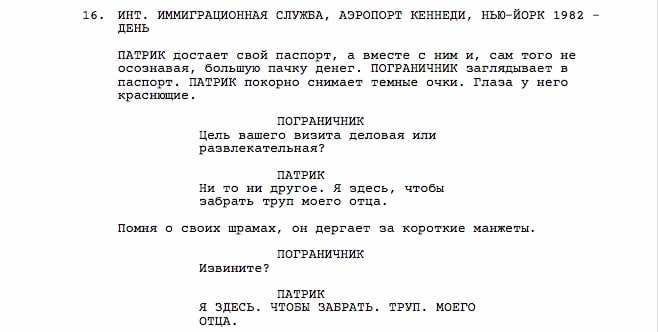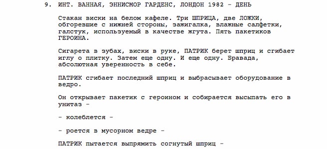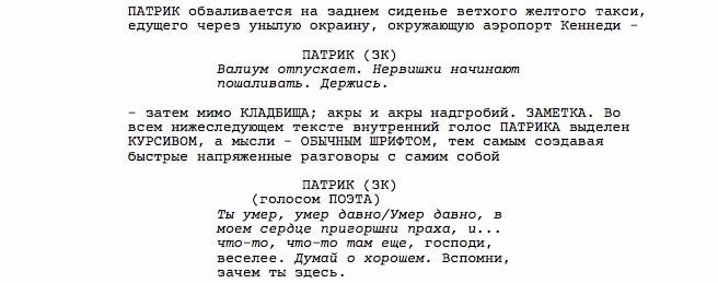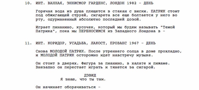 На финальном монтаже у нас, впрочем, все выглядит немного иначе. В угоду зрительскому восприятию свои собственные мысли Патрик произносит вслух, в то время как в сценарии весь диалог разворачивается закадровыми голосами.