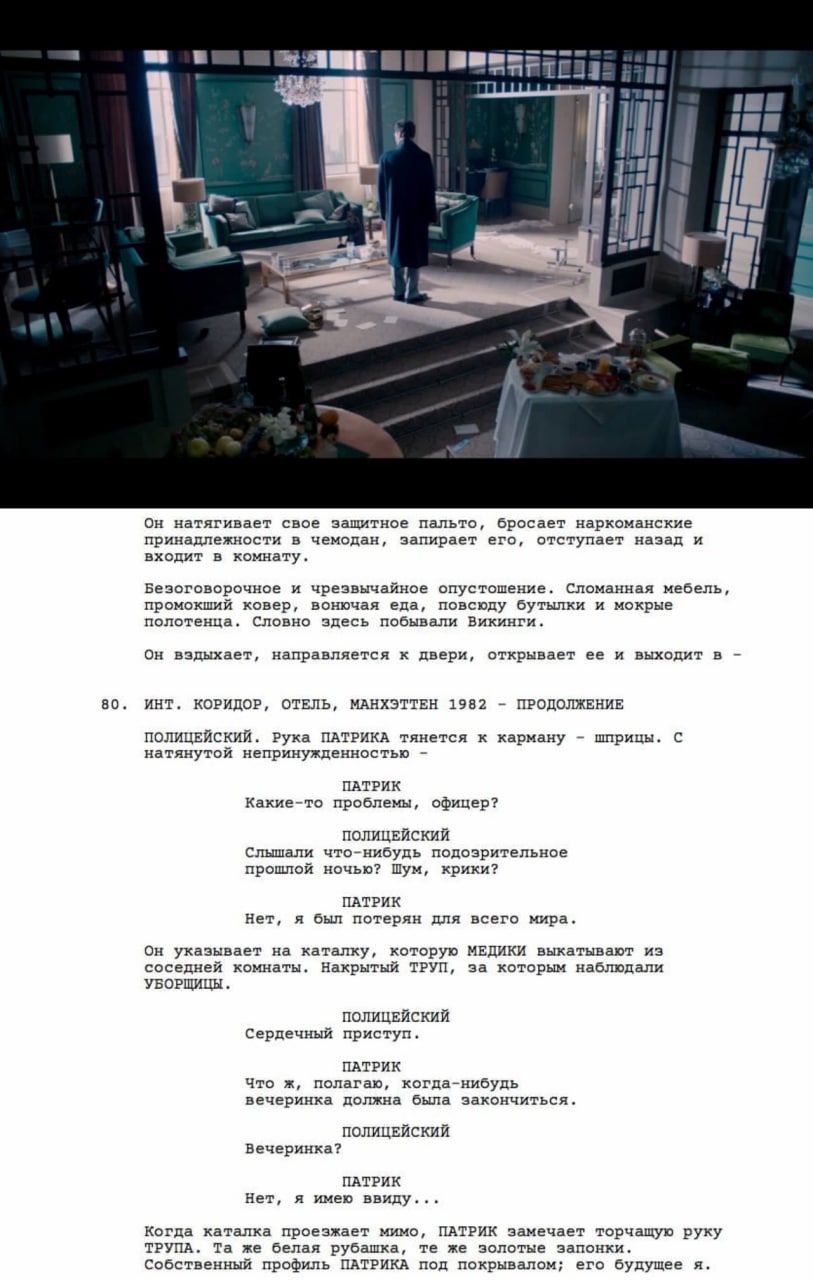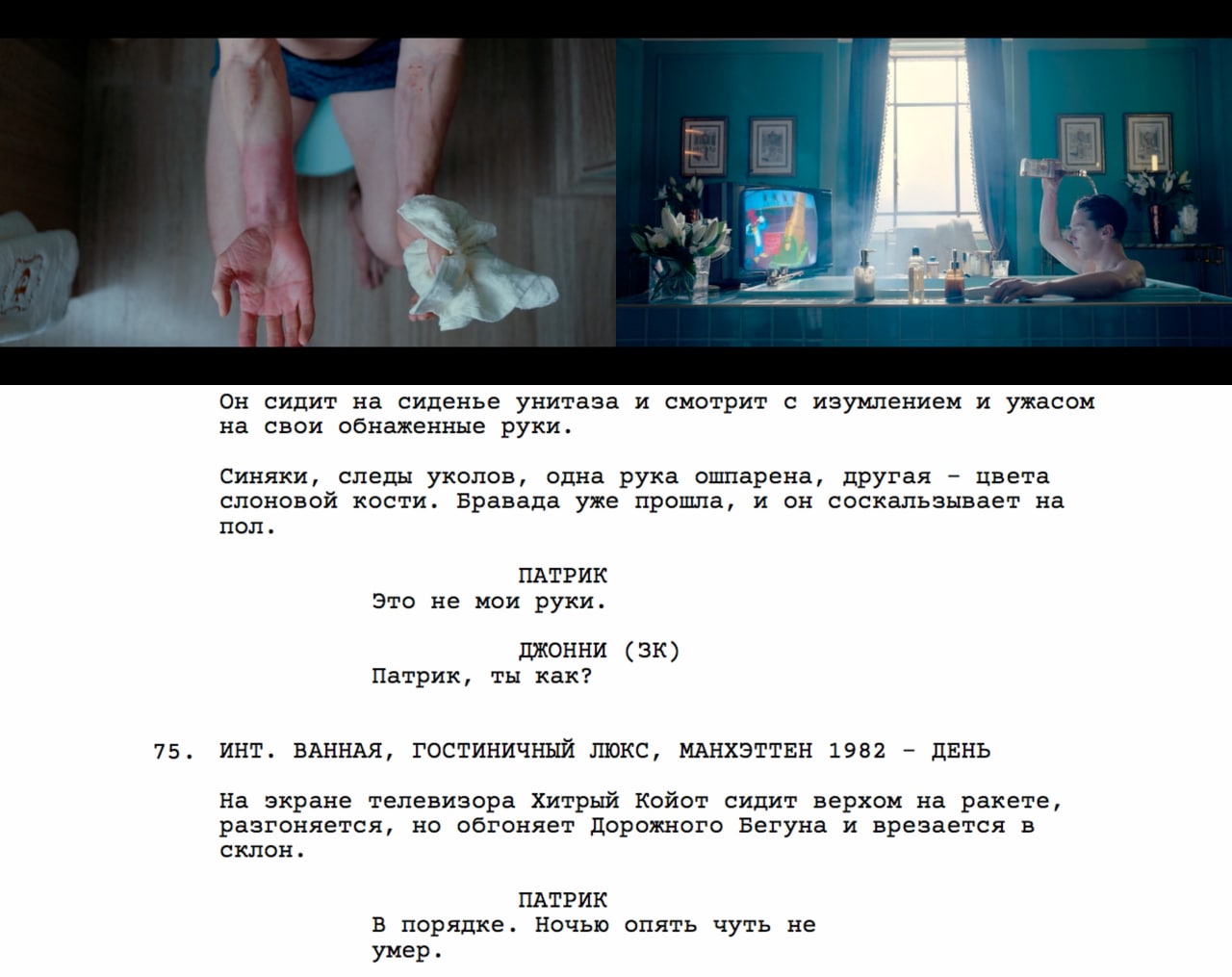 Сценарий — это сборник нескольких десятков самых разных сцен. По динамике. По продолжительности. По эмоциональному окрасу. По назначению. По уровню напряженности. И клево конечно, когда сценарист может передать всю эту палитру через содержание самих сцен. Но меня всегда особенно привлекали авторы, которые способны передать это еще и стилистически. Потому что написать две разные сцены — сложно.