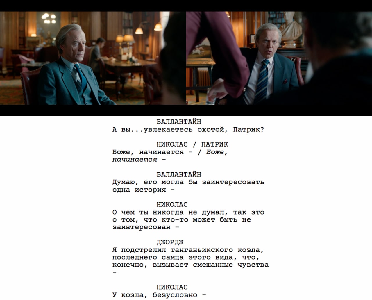 Вообще, кстати, на монтаже в этой сцене гораздо больше интересного, чем в сценарии. Этот постоянный взгляд раздраженного, но одновременно сочувствующего Николаса на Патрика. Ничего не понимая озирающийся Баллантайн. Сам нервно-ликующий Патрик, в конце концов.