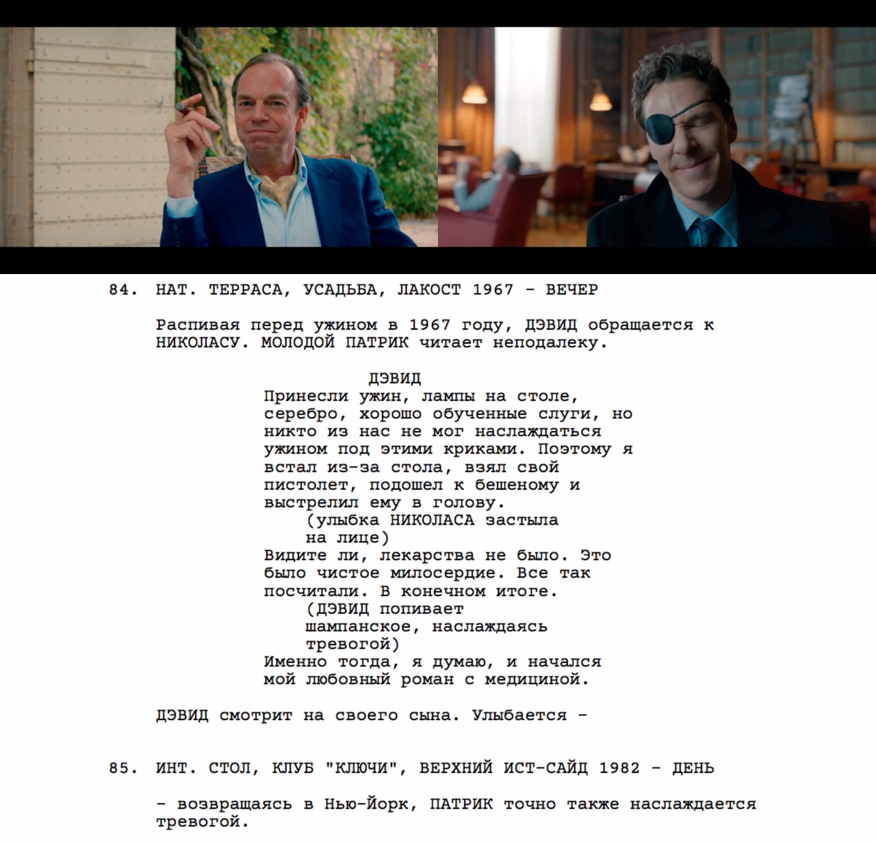 Пока что мой кумир в представлении персонажей — это конечно МакНамара, который в своей «Великой» позволяет себе массу допущений, в том числе представить героя не в сцене его фактического появления, а в следующей, или вообще через несколько. Но вот такие вот штуки с описанием внутри пометки к диалогу — тоже интересный ход.