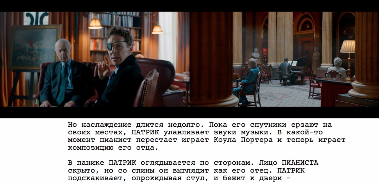 Пока что мой кумир в представлении персонажей — это конечно МакНамара, который в своей «Великой» позволяет себе массу допущений, в том числе представить героя не в сцене его фактического появления, а в следующей, или вообще через несколько. Но вот такие вот штуки с описанием внутри пометки к диалогу — тоже интересный ход.