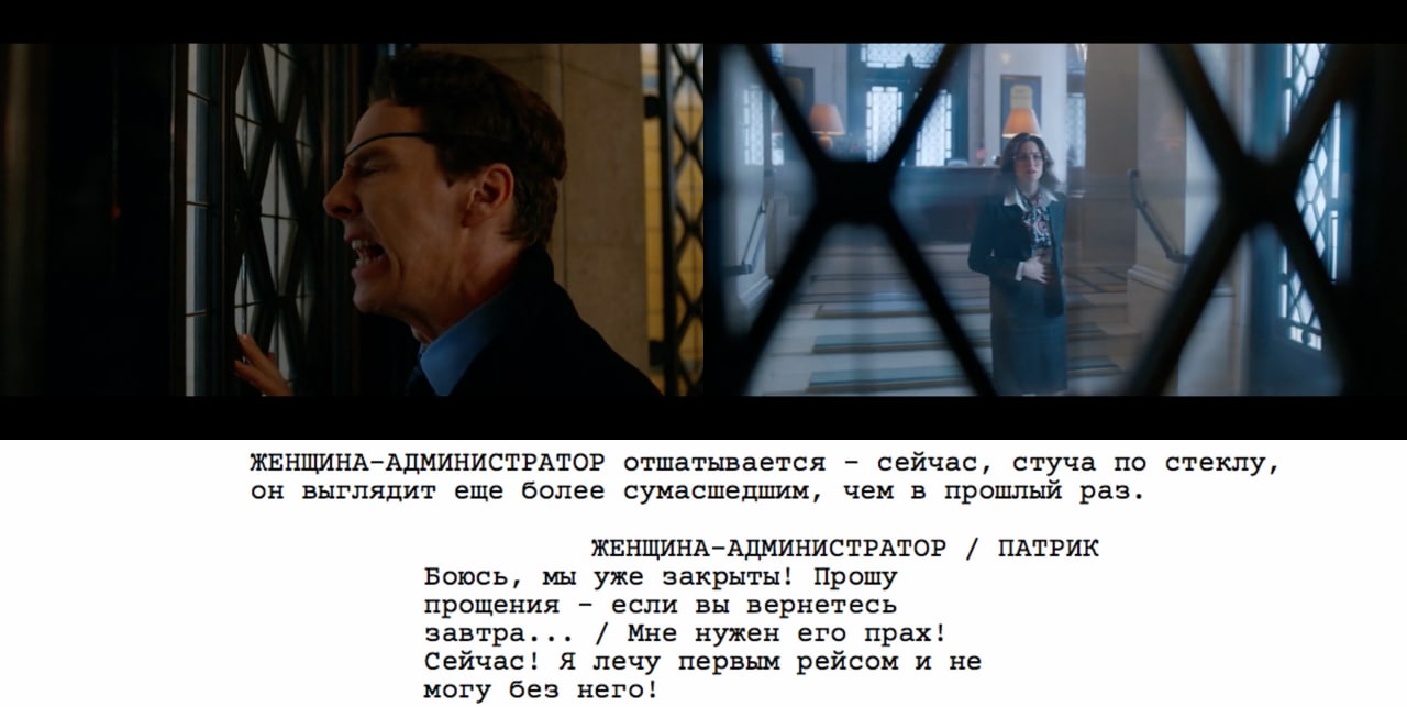 Пока что мой кумир в представлении персонажей — это конечно МакНамара, который в своей «Великой» позволяет себе массу допущений, в том числе представить героя не в сцене его фактического появления, а в следующей, или вообще через несколько. Но вот такие вот штуки с описанием внутри пометки к диалогу — тоже интересный ход.