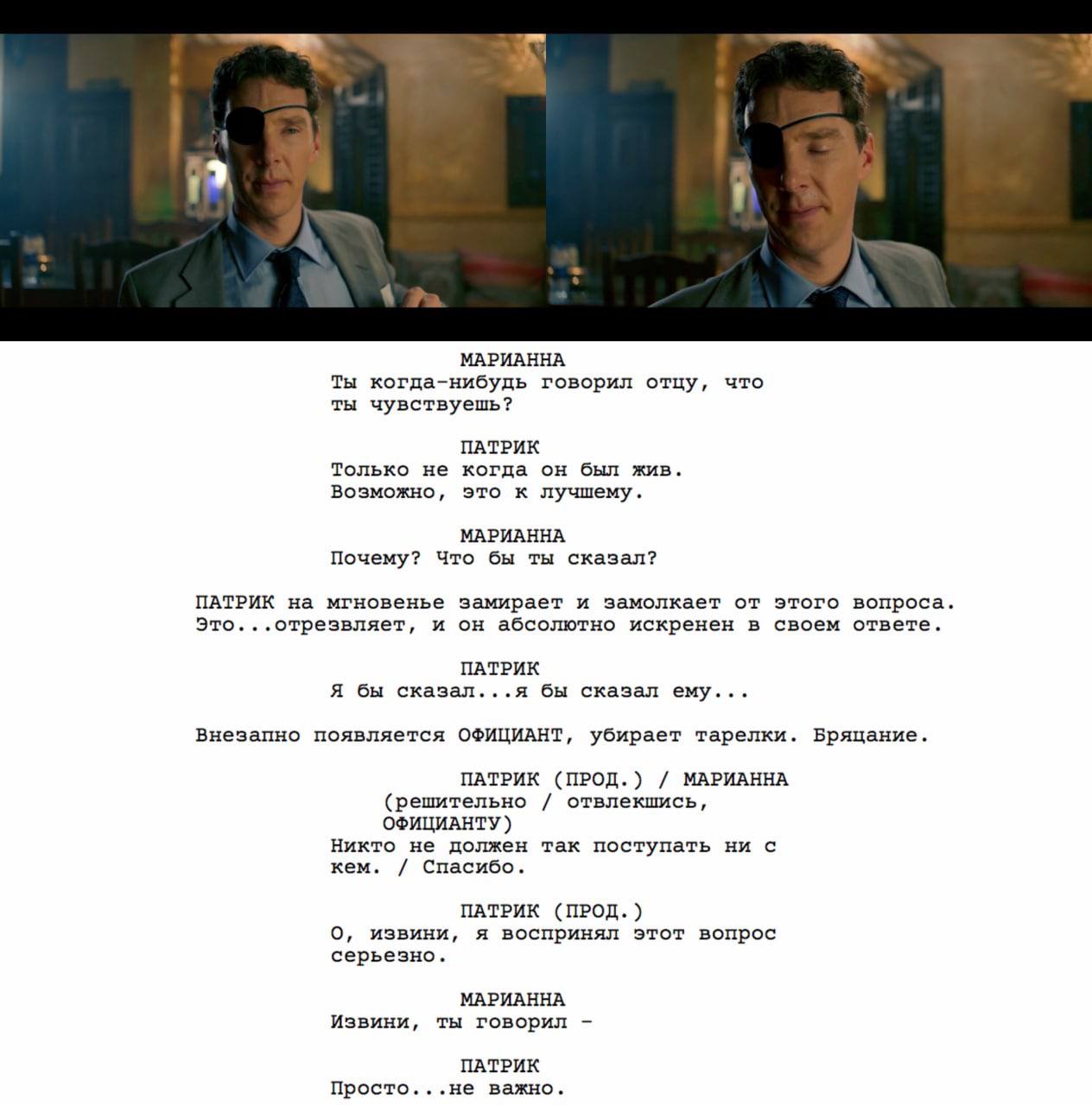 В то время как в сценарии, как мы видим, у нас даже никаких ремарок к фразам нет.