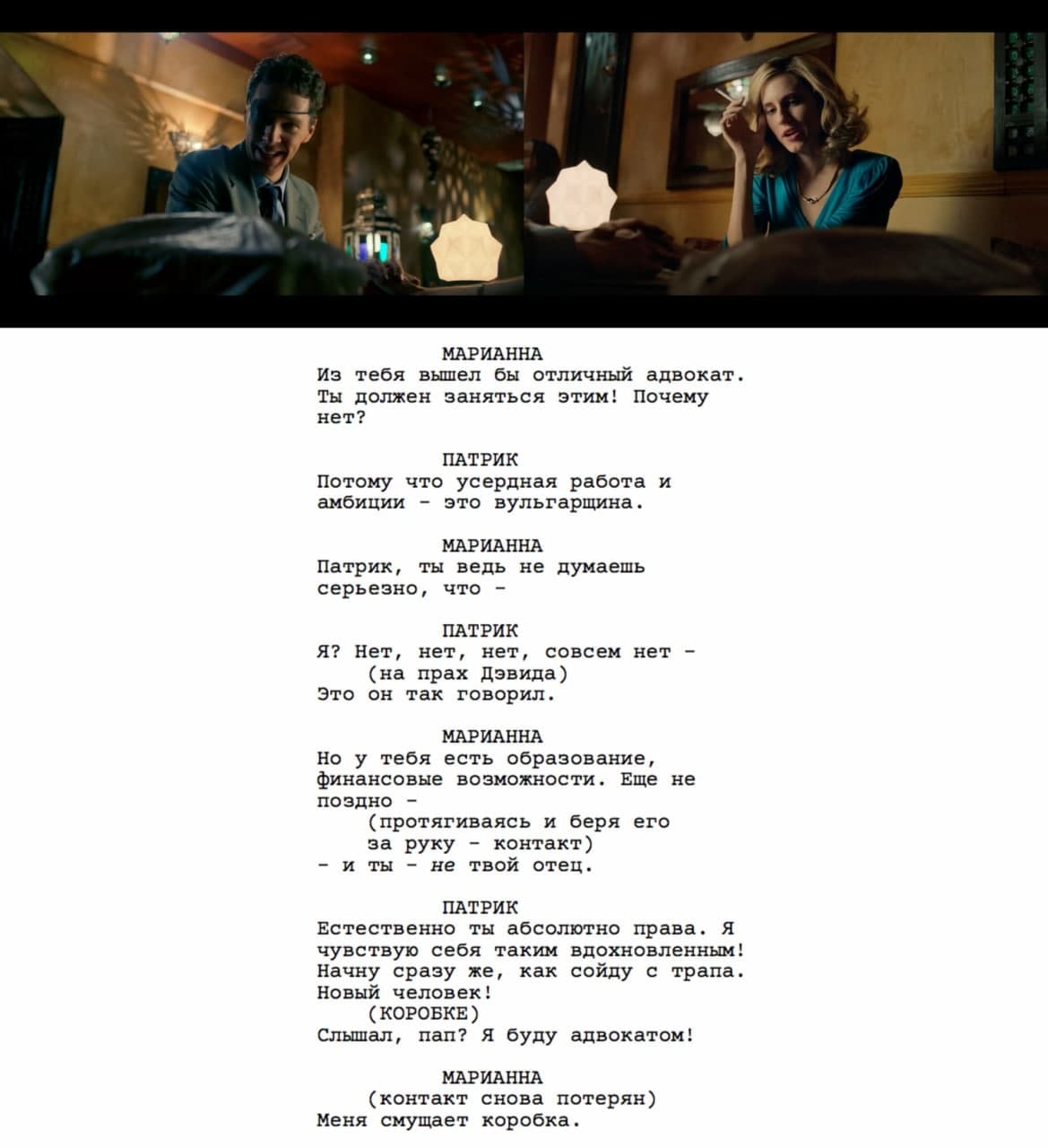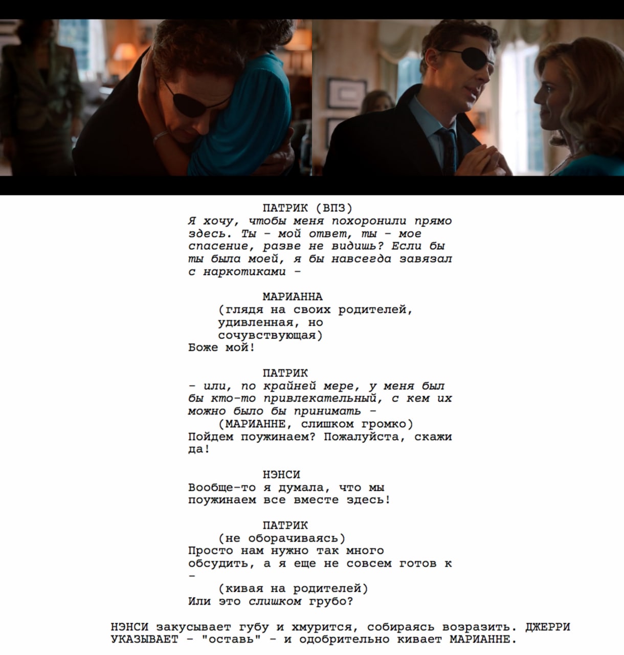 Я здесь, чтобы сказать только, как много контекста порой можно создать всего двумя строчками. В этих последних двух строчках — никаких диалогов, практически никаких действий, но зато столько информации об отношениях внутри семьи Марианны, сколько до этого не было во всей сцене.