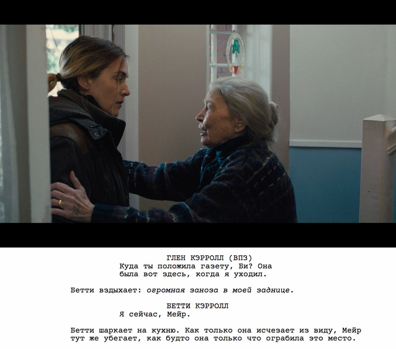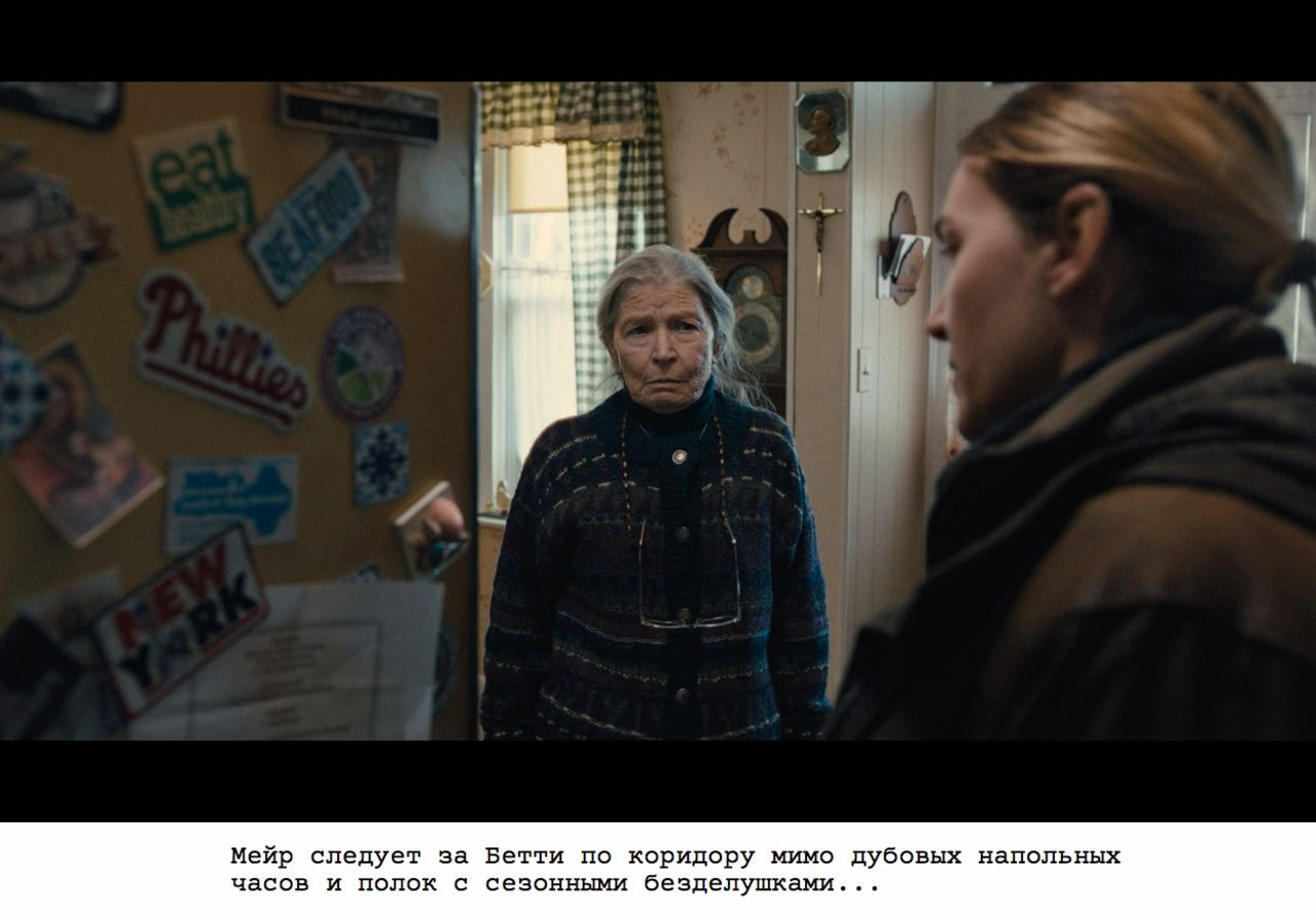 Открывающая сцена в пилоте «Мейр из Исттауна» длится почти 7 минут. Не то чтобы рекордно много, но и не мало (пускай и на монтаже почти в два раза меньше). Для сравнения, это самая длинная открывающая сцена среди всех, что были в разобранных мной ранее сценариях. И это при том, что в ней, по сути, нет вообще ничего.