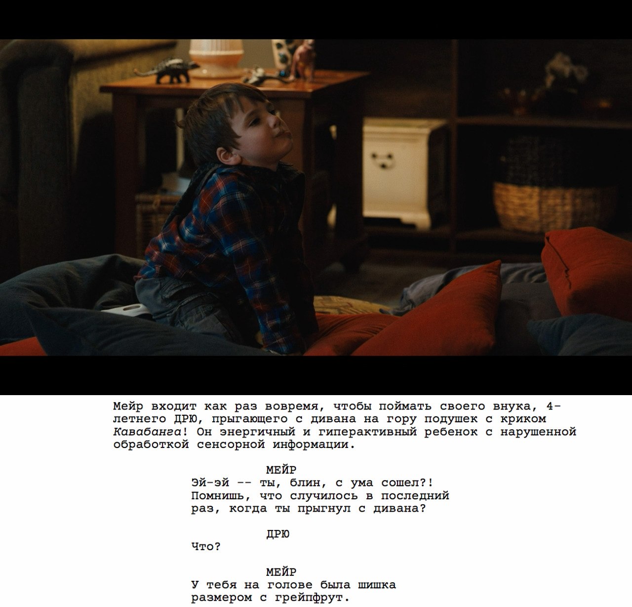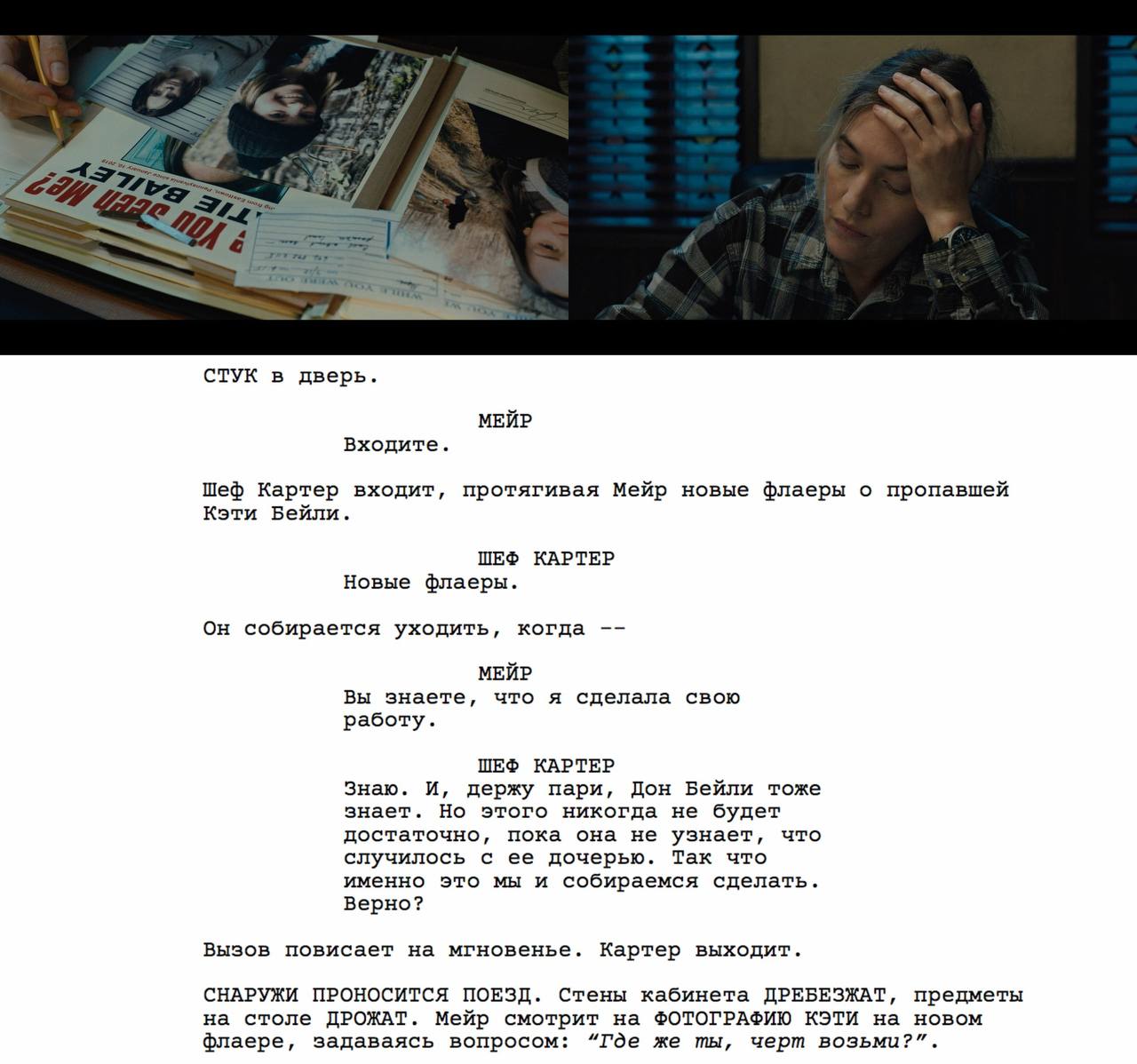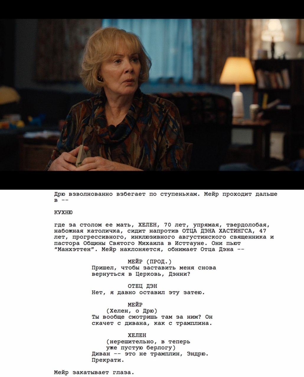 Когда читаешь сценарий, момент с кроссовком прям бросается в глаза и кажется лишним. Потому что никакой дополнительной информации нам это действие не дает (мы и так уже видим, что Мейр подвернула ногу, раз она хромает), зато прилично так ломает темп сцены.