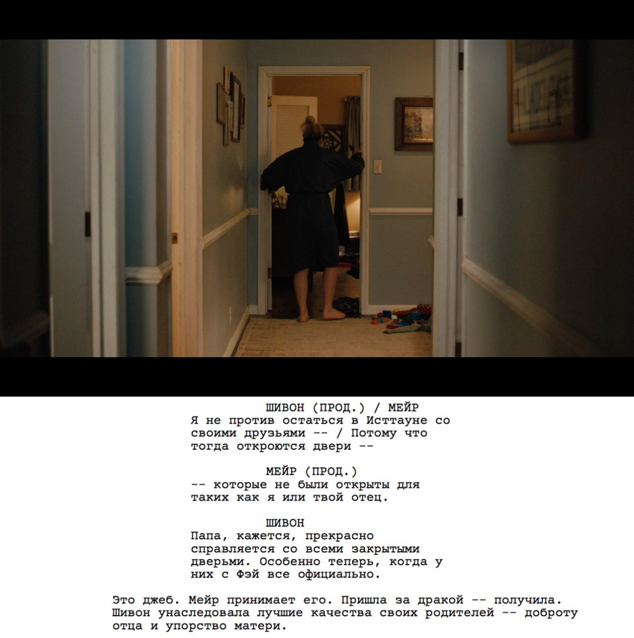 Продолжаем разбирать сценарий «Мейр из Исттауна» и на 35-й странице видим очередной гений презентации персонажа.
