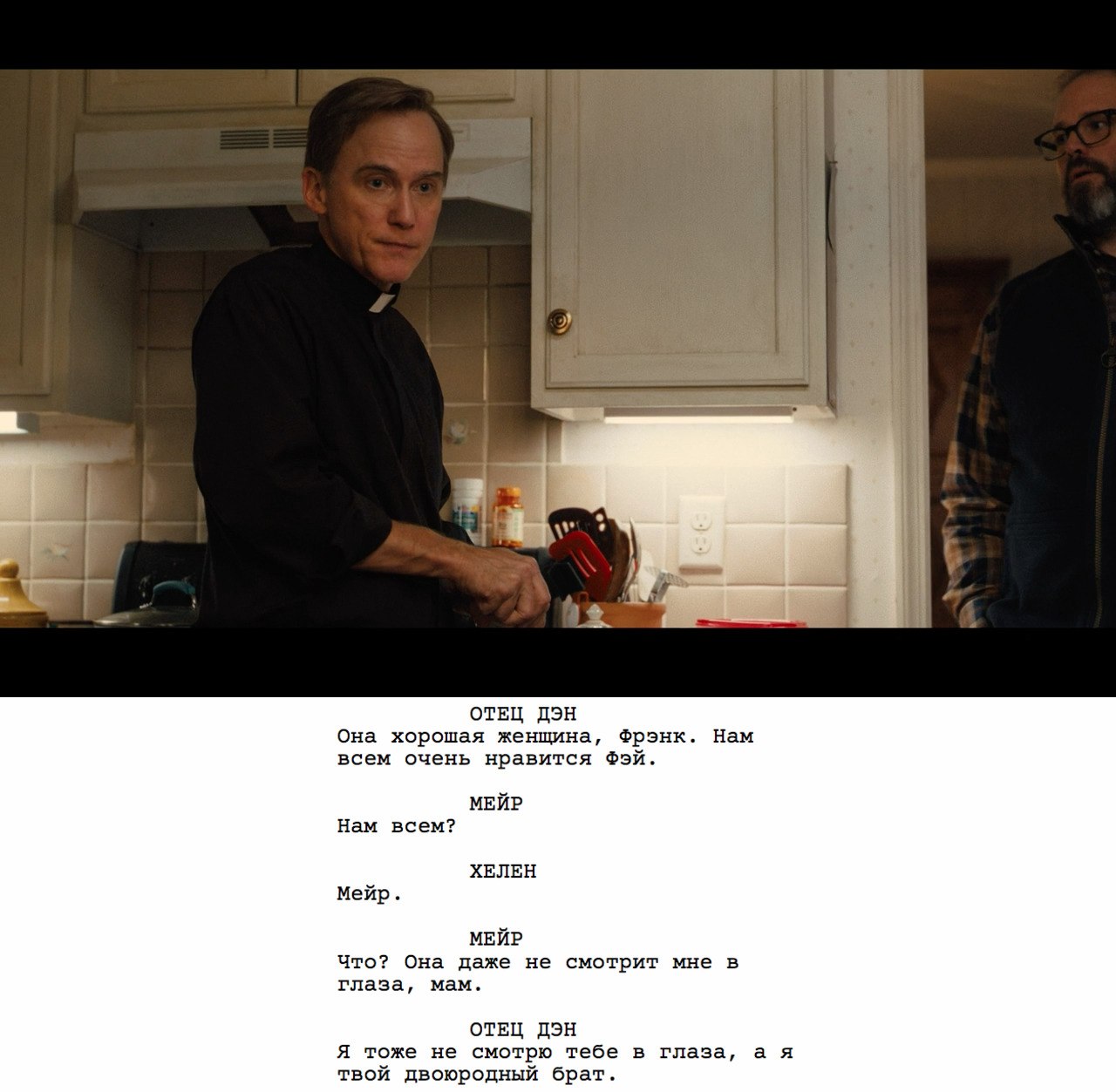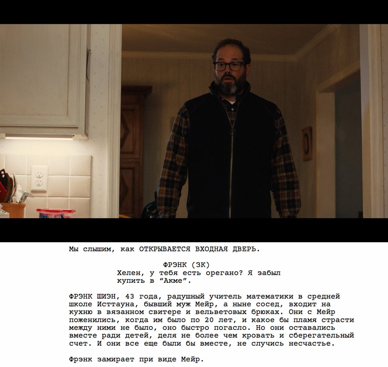 Будем честны, драматически вся сцена на кухне, которая длится, на секундочку, целых пять (!) страниц, не самая интересная. Она оживляется лишь в момент появления Фрэнка и потухает с его же исчезновением. Потому что он приносит с собой конфликт, хоть как-то разбавляющий бытовуху, что тащится на одной лишь харизме актеров.