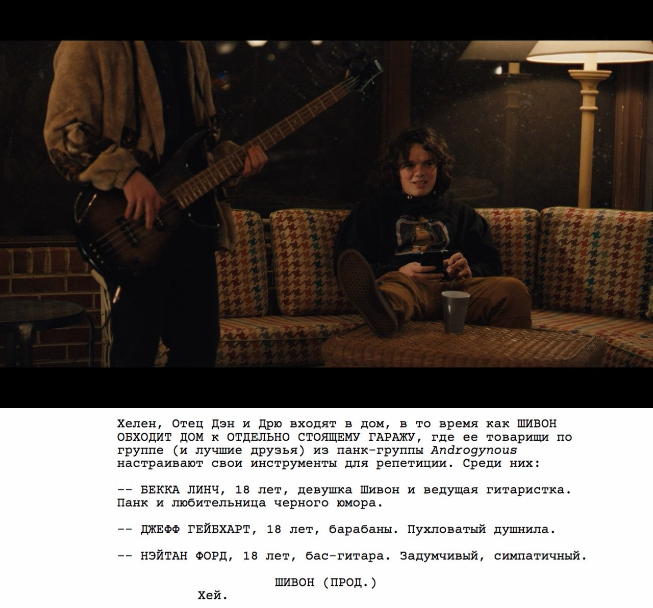 Но вот ты оказываешься на 40-й странице сценария и читаешь, как целую сцену не происходит абсолютно ничего кроме бытовой ссоры нескольких подростков. Каждый из которых перед этим, будучи полноценным участником панк-группы Androgynous (!), представлен отдельной строкой.