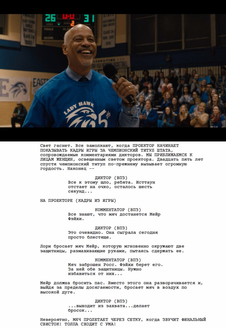 Первое — демонстрация того самого матча. На монтаже мы этого не видим, но в сценарии это полноценный «флэшбэк». Мы буквально смотрим отрывок матча с комментариями дикторов.