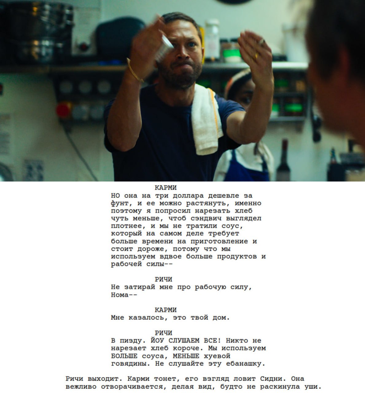 И, в-третьих, не только гениальный седьмой эпизод — но вообще все шоу снималось как театральная пьеса. В том смысле, что операторы не использовали наушники и рации для направления и корректировки камер непосредственно в процессе, они обсуждали сцену перед ее съемкой, а затем просто делали свою работу. Потому что на профессиональной кухне если тебе нужно остановиться, чтобы начать что-то объяснять, — значит ты в жопе.