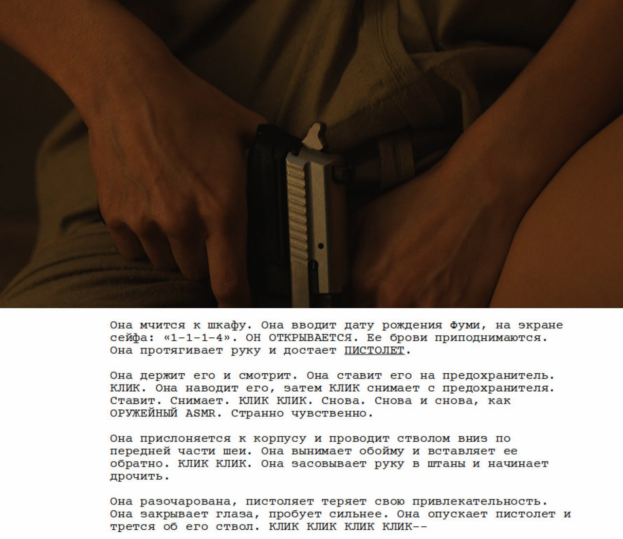 В сценарии динамика сцены очень легко считывается за счет капса, курсива, подчеркиваний и обозначения звуков (и нарастающей фоновой музыки), а также благодаря жонглированию короткими и длинными предложениями. На монтаже все это будто бы сливается в один сплошной экшн и теряются акценты.