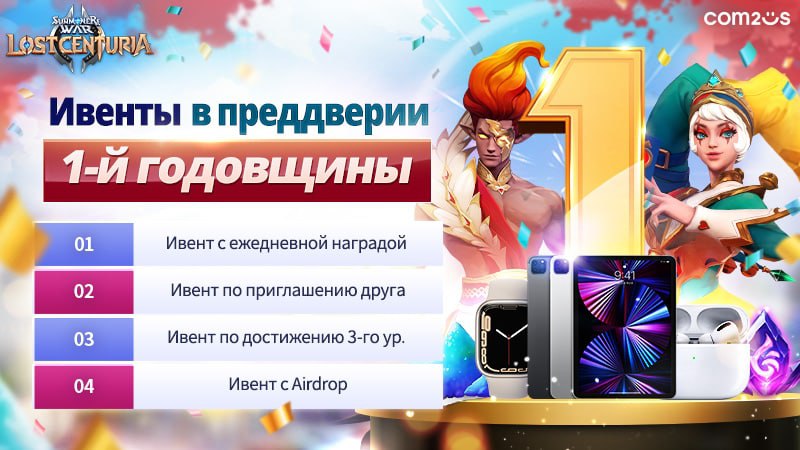 Мы будем проводить ивенты в преддверии 1-й годовщины Summoners War: Lost Centuria, чтобы отпраздновать эту приближающуюся знаменательную дату! Примите участие в ивентах, чтобы получить новую внутриигровую валюту Волшебный порошок и шанс выиграть потрясающие призы!