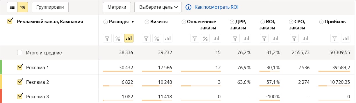 Отчёт «Источники, расходы и ROI» поможет принимать стратегические решения о том, как распределять бюджет на рекламу между каналами и можно ли их масштабировать.