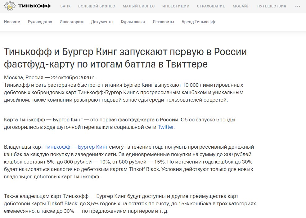 О чем: Тинькофф и сеть ресторанов быстрого питания Бургер Кинг выпускают 10 000 лимитированных дебетовых кобрендовых карт Тинькофф-Бургер Кинг с прогрессивным кэшбэком и уникальным дизайном. Также компании разыграют годовой запас еды среди пользователей соцсетей.