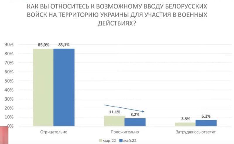 Это вовсе не проукраинская позиция. Даже среди убежденных противников власти, доля которых колеблется в райне трети, симпатии на стороне Украины лишь у 40%. В основном антивоенный консенсус - это установка на нейтралитет и отказ от позиционирования по данному вопросу, такое мнение выражают порядка 45% беларусов. Еще примерно 30-45% в той или иной степени симпатизируют России.