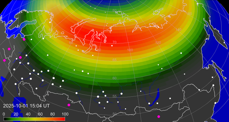 В интервале времени между 17 и 18 часами по московскому времени над восточной частью страны на короткое время формировалась интенсивная зона полярных сияний. В настоящее время вероятности наблюдения авроры снова понизились, но к 20-21 часам по московскому времени, когда на большей части европейских регионов страны существенно стемнеет, возможно возобновление сияний третью ночь подряд (исключительно редкий случай).
