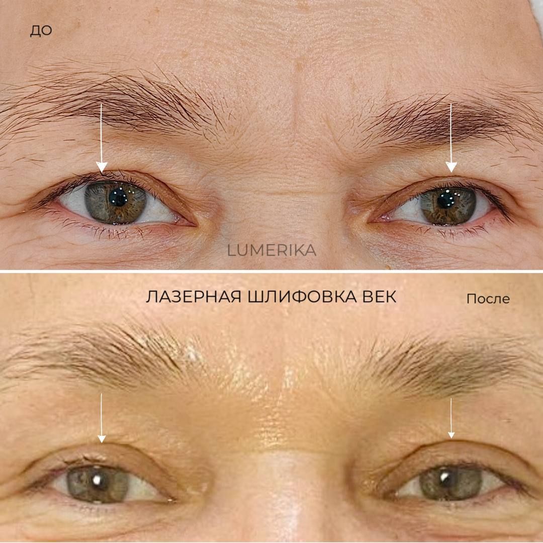🟢 Опущение верхнего века и внешнего уголка глаза можно скорректировать лазерной шлифовкой или микроигольчатым RF лифтингом. Эти процедуры малотравматичны и дают великолепный результат (смотри фото)