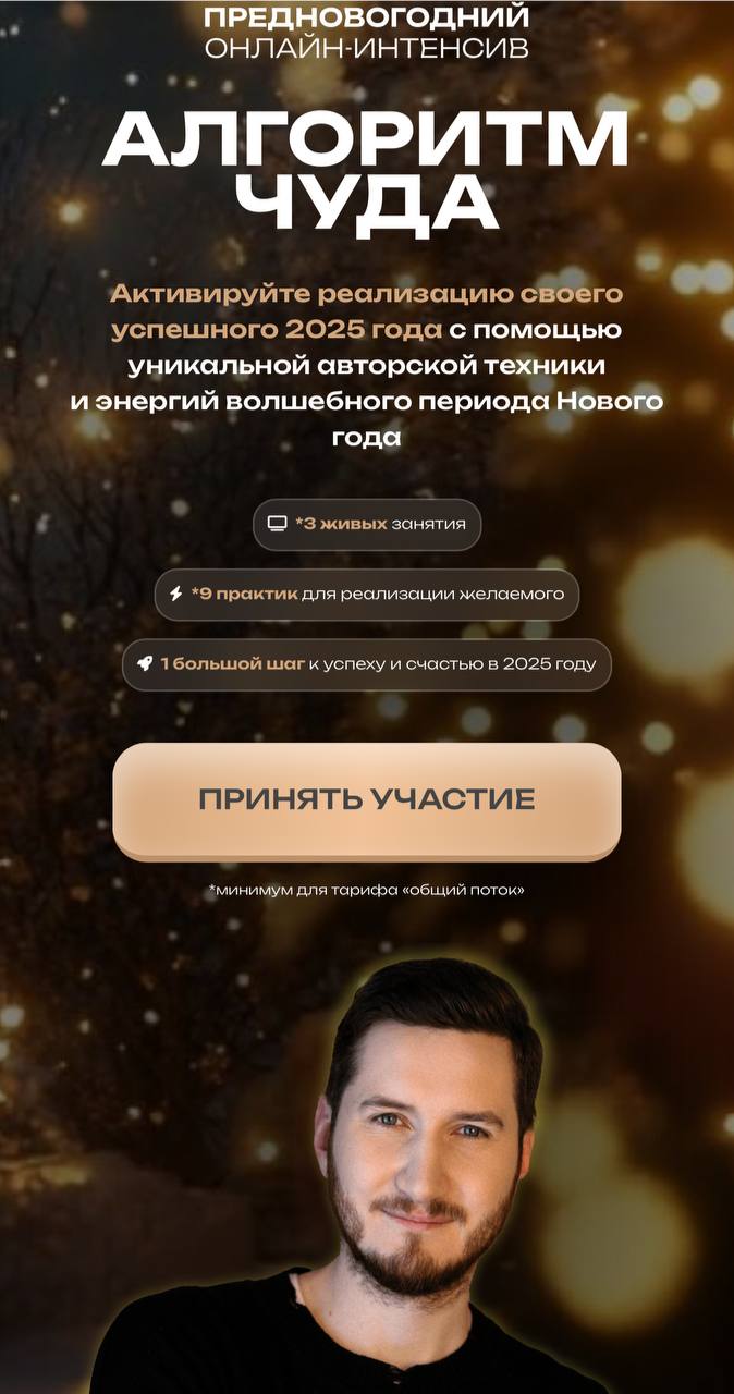 И поэтому я хочу пригласить вас на свой интенсив «Алгоритм чуда», который как раз рассказывает, как настроиться на поток, энергии 2025 года, как его освоить, как двигаться в следующем году с помощью него, реализовывать все свои цели и желания