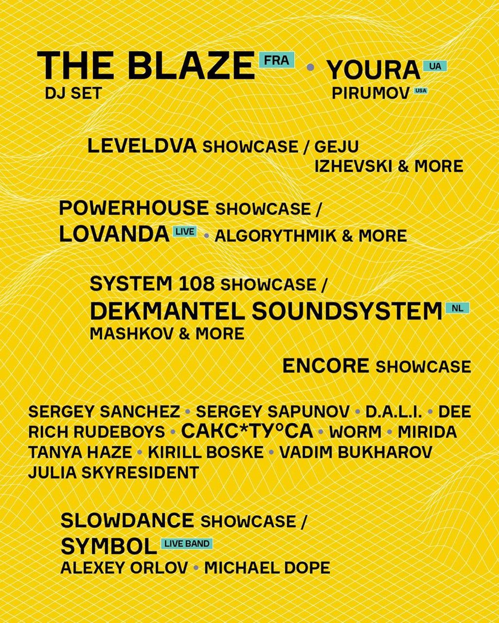 Компанию им составит Юрий Бардаш со своим проектом YOURA, шоукейс System 108 с основателями голландского фестиваля Dekmantel, шоукейс Powerhouse с фанк-поп группой LOVANDA и сетом Андрея Алгоритмика, хип-хоп шоукейс Encore Squad, шоукейс Slowdance с лайвом SYMBOL и многие другие.