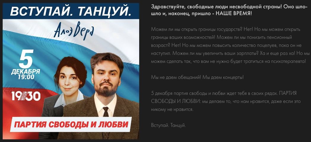 В конце года «Партия свободы и любви» даст два концерта в столицах. Редкий случай, когда мне нравится пресс-релиз настолько, что оставлю его вместе с афишей.