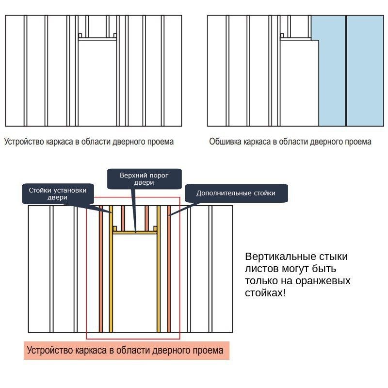 2. При монтаже гипсокартона была нарушена технология. Дверные проемы должны выполняться строго по монтажным картам производителей профилей и гипсокартона. Над дверными проемами должны быть дополнительные промежуточные стойки для крепления гипсокартона. Не должно быть стыков листов гипсокартона по вертикальным линиям дверной коробки!