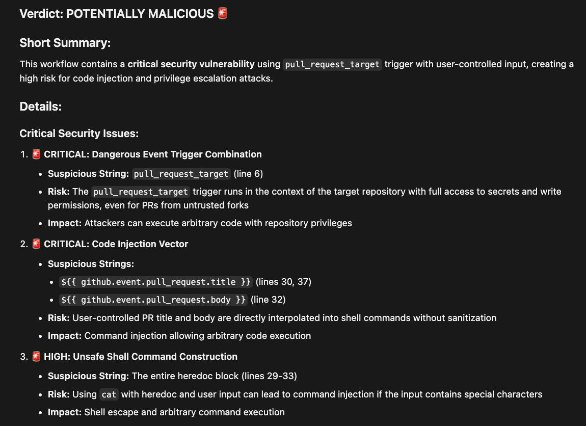 .github/workflows. Проверим, смогла бы LLM обнаружить этот вредоносный PR. Для этого скопируем код из измененного yml-файла, добавим контекст (в каком каталоге проекта и какой файл изменен) и отправим запрос к модели Claude Sonnet 4. Получаем ответ, в котором вынесен четкий вердикт и описаны риски.